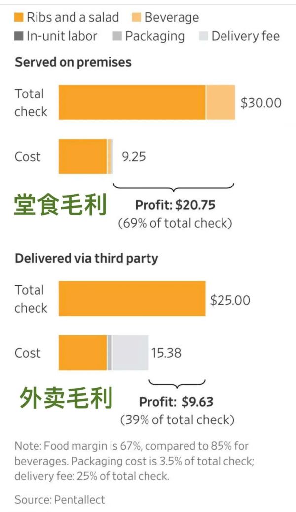 一位华人网友说,疫情初期他在美国连续点了5个月外卖,算下来比平时去同样店铺堂食贵了50%。美国餐饮咨询机构Pentallect曾针对餐厅的堂食和外卖成本结构做过分析(下图),堂食订单包括主食和饮料,一共30美元,商家毛利高达20.75美元;而外卖订单假设不点饮料,花费25美元,其配送费+包装费基本与食物成本相当,商家毛利降至9.63美元。