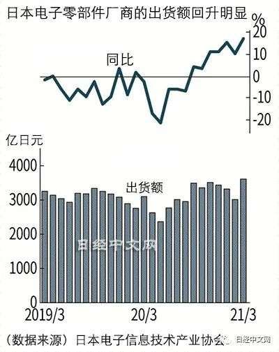 由于订单保持在高水平,目前出货也呈现出强劲势头。日本电子信息技术产业协会(JEITA)5月31日发布的数据显示,日本电子零部件厂商3月的全球出货额达到3611亿日元,同比增加17%。出货额比疫情前的2019年3月高出356亿日元,连续7个月超过去年同期。2020年度的累计出货额虽受到疫情影响,但比2019年度增加1%,达到3.746万亿日元,实现正增长。