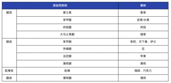 电子烟的烟油含有多种香味添加剂,按照化学元素类别可分为醛类、醇类、吡嗪、酮类,以及包括乙基麦芽醇在内的甜味剂(如下图表)。