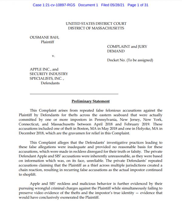 奥斯曼在起诉书中提到,苹果公司在使用面部识别技术追踪涉嫌盗窃犯时可能错误将小偷的脸自动识别为奥斯曼的脸。而后这名小偷又继续在其他地区的苹果商店行窃,就导致奥斯曼被认为是连环盗窃嫌犯。