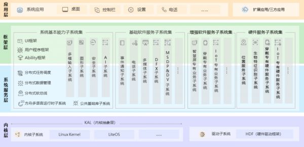 具体而言,内核层方面:支持多内核,内核抽象层(KAL,Kernel Abstract Layer)屏蔽多内核差异,对上层提供统一的内核能力,如进程 / 线程管理、内存管理、文件系统等。驱动框架(HDF)则提供统一外设访问能力和驱动开发、管理框架。