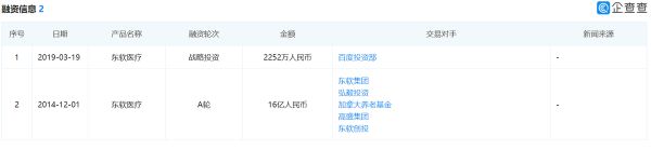 就融资历程来看,据企查查显示,东软医疗目前只经历过2轮融资,但在2014年的首轮融资中,就获得了当时业内的最大单笔投资,高盛、弘毅、百度等知名机构纷纷参投。