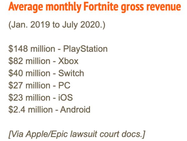 《堡垒之夜》自2019年1月至2020年7月总计18月份的各个平台收入