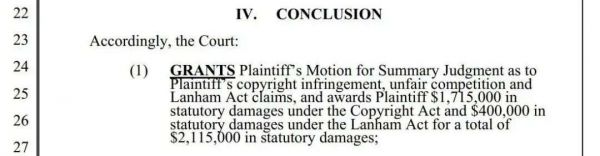 最终,经过法院酌情判断,RomUniverse网站运营者需要按每部3.5万美元的价格,赔偿49件受版权保护的游戏作品,共计171.5万美元;同时赔偿所有侵权作品的商标费用40万美元。最终网站运营者需要支付版权赔偿和商标赔偿费用共计2115000美元。