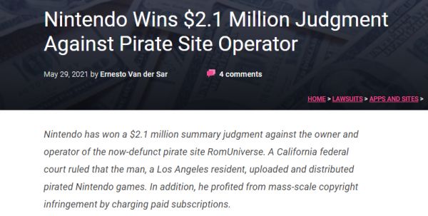任天堂对盗版网站侵权案胜诉,获赔210万美元