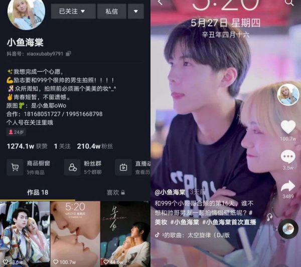 这个账号叫“小鱼海棠 ”,在不到一个月的时间里,靠18条视频在抖音涨粉200多万,其中3条视频的点赞均破百万。