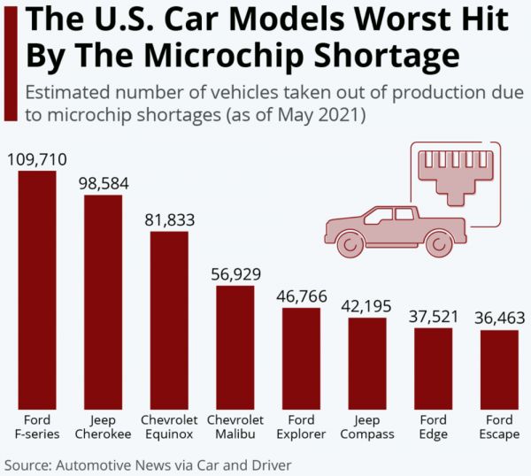 @东方财富网【受持续的芯片短缺影响,北美已有数十万辆汽车停产】持续的芯片短缺影响,北美已有数十万辆汽车停产。数据显示,在北美汽车制造商中,福特已停产346616辆汽车,通用汽车产量则减少了277966辆。在受影响最严重的车型中,福特F系列皮卡位居榜首,其产量减少了109710辆。