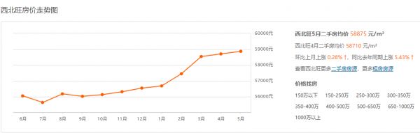 根据安居客数据显示,截至2021年5月,西北旺地区二手房均价为 58875 元/m²,环比上月上涨 0.28% ,同比去年同期上涨 5.43% ,自2020年9月以来价格一直处于上涨趋势。