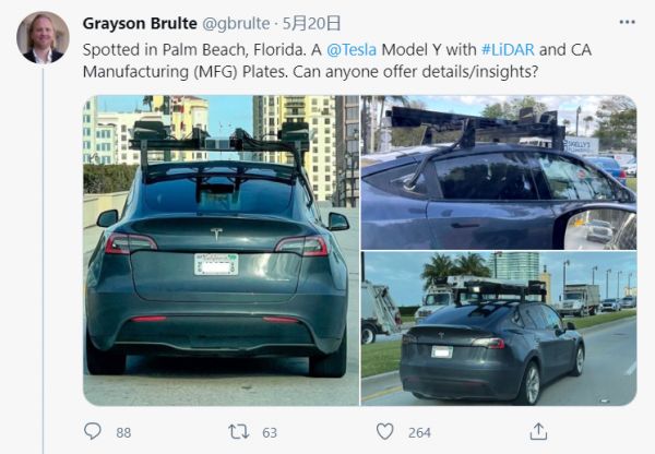 一位来自佛罗里达的自动驾驶行业顾问,Grayson Brulte,近日在推特上发布了几张照片,称看到一辆特斯拉顶着一套“疑似”激光雷达的设备。