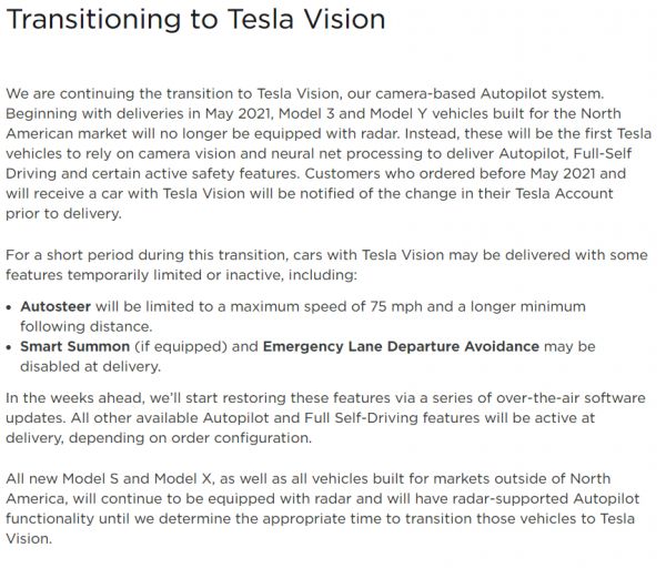 5月26日,特斯拉发布公告,称将继续推进Tesla Vision过渡:从5月份开始,为北美市场生产的Model 3 和 Model Y两款车型将不再搭载雷达。这将是特斯拉首次完全依赖摄像头视觉和神经网络处理来实现自动驾驶、全自动驾驶和某些主动安全功能[4]。