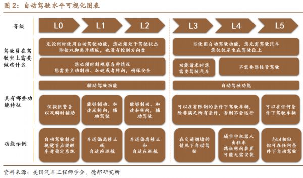 根据美国汽车工程师学会,自动驾驶被划为6个等级,等级越高则车载系统参与的决策与控制比例越高。