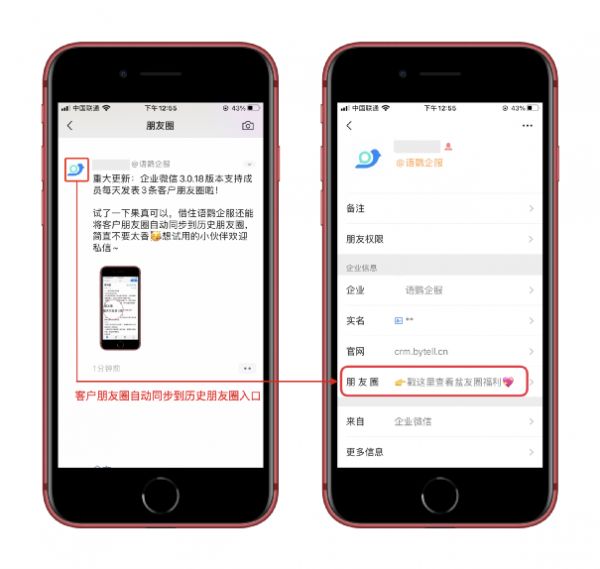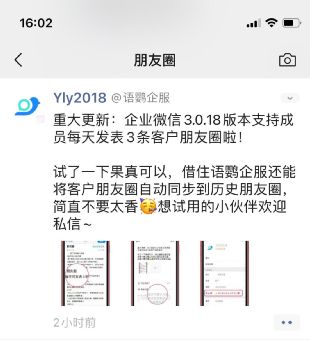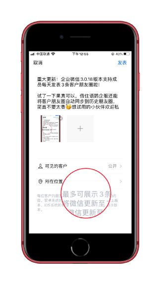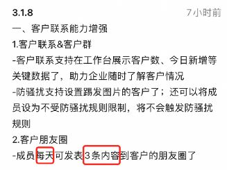 以前,企业微信朋友圈每天只能发送1条内容。而在最新的 3.1.8 版本中,成员每天可发表3条内容到客户朋友圈。这无疑增加了企业在客户朋友圈的展示,增加了品牌营销渠道和活动推广力度。