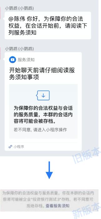 除了朋友圈功能以外,企业微信还更新了一直烦人打扰的会话内容存档提示,由原来的小程序卡片样式变为了文字链,新用户进群也不会重复提示,不侵犯用户隐私的前提下大大提升了用户体验。