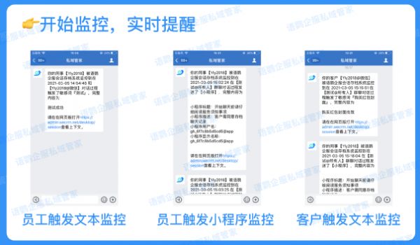 通过开启会话存档功能,企业可设置敏感关键词,一旦有员工触发了敏感词,就会给质检人员发送实时提醒,有效防止员工私下拿回扣、飞单等违规操作。结合企业微信敏感词拦截功能,还可以直接拦截不让员工发送。