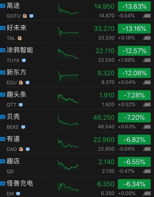 新东方收跌12%,盘中一度大跌27%,消息面上,新东方港股被剔除富时罗素指数;高途跌13.83%;好未来跌13.16%;趣头条、贝壳均跌超7%;