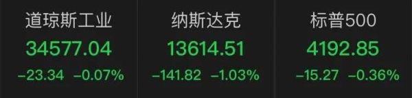 截至收盘,道指跌23.34点,报34577.04点,跌幅为0.07%;纳指跌141.82点,报13614.51点,跌幅为1.03%;标普500指数跌15.27点,报4192.85点,跌幅为0.36%。