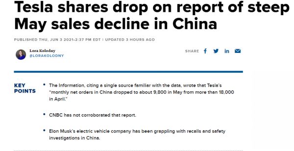 消息称中国市场5月份订单减半 特斯拉一天蒸发约2000亿