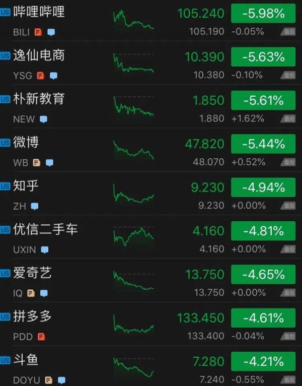 另外,百度跌近4%;京东跌1.33%;阿里巴巴跌1.16%;哔哩哔哩跌6%;微博跌5.44%;爱奇艺跌4.65%;拼多多跌4.61%。