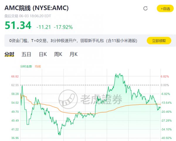 美股午盘时,AMC日内最深跌41.6%,日低至37.66美元,几乎回吐了周三以来全部涨幅。