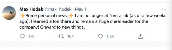 5月初,Neuralink的联合创始人Max Hodak正式宣布离职,毕业于杜克大学生物医学工程的Max,此前一直是Neuralink技术团队的核心人物,曾经还出任过Neuralink的CEO。