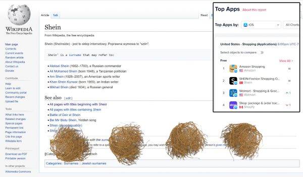 这是Shein的维基百科页面,估值达150亿美元,在美国应用商店购物类排行榜超过沃尔玛,Shopify和耐克的一家公司。