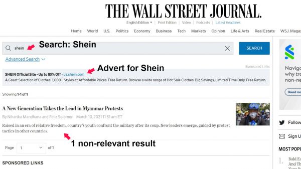 迄今为止,这种做法是奏效的。服装品牌排名没有它的名字。去《纽约时报》网站上搜索“Shein ”,结果为空。《华尔街日报》——也没有。但是Shein仍针对这些搜索投放广告。