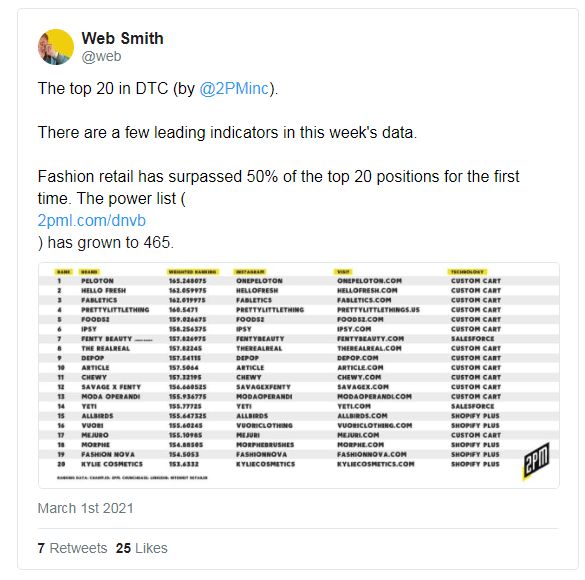 Shein并不是唯一一家利用社交媒体去卖时装的公司。2010年代中期左右,一波直接面向消费者的时尚初创企业开始越来越受欢迎。Boohoo,ASOS和Fashion Nova等纯粹的在线品牌也很了解社交媒体的作用,知道它不仅可以促进推广,还可以预测新趋势。这些新型公司与靠近当地消费者的本地工厂合作,让快时尚更上一层楼,成为“超快时尚”。” Richard Saghian是总部位于洛杉矶的Fashion Nova 的创始人,他把公司的崛起说成是“我们甚至连真正的策略都没有。发展得太快了,有点骑虎难下。”Fashion Nova目前在2PM的DTC Power List当中排名第一,榜单的前20名当中50%以上都是时装公司。但Shein很神秘地不在榜单之列。