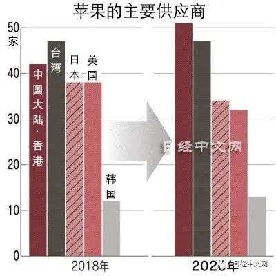 在过去10年以上维持首位的台湾为48家供货商,与2018年的47家相比小幅增加。从事代工的鸿海精密工业与和硕联合科技等依然是重要供货商,但面临与中国大陆企业的竞争。