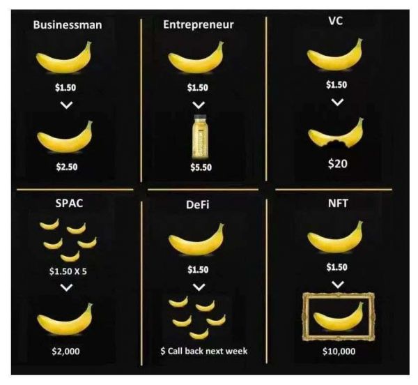 ▲一根1.5美元的香蕉在商店能赚1美元,经过VC的包装能卖到20美元,在NFT玩家手里能炒到1万美元