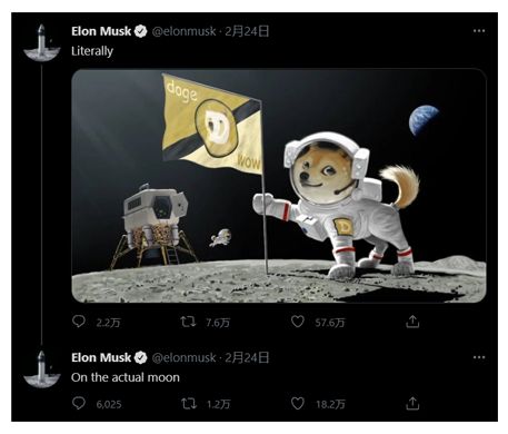 ▲马斯克在推特上多次鼓吹狗狗币,还号称要把狗狗币送往月球图片来源:马斯克推特账号