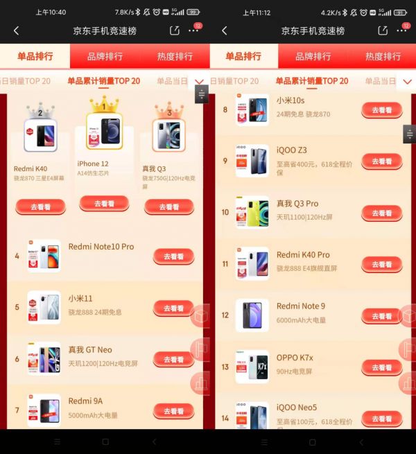 让我们先来看下京东单品销量的累计榜,这份榜单统计的是从6月1日到6月4日卖得最好的手机产品。可以看到,在单品销量上排名第一位的,竟然是一直被大家吐槽的iPhone 12。作为一款价格不菲的旗舰产品,iPhone 12的单品销量居然压过了真我Q3、Redmi K40和Redmi Note10 Pro等性价比机型,简直不可思议。