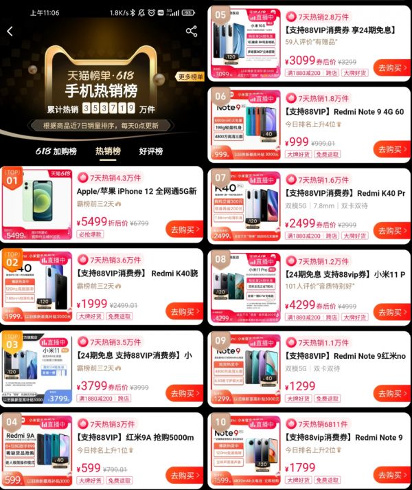 值得注意的是,除了性价比产品的销量表现出色以外,小米的高端旗舰机同样拥有着不错的表现。目前,小米11在京东单品累积销量榜上排名第五位,在天猫单品销量榜上排名第三位。这款产品也是目前几家电商平台销量TOP 5中,唯一一款售价超过3000元的安卓旗舰手机。由此看来,小米的高端战术确实初有成效。