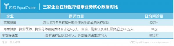 除了收入本身的比较,围绕互联网医疗业务,更值得关注的是,3家企业的核心运营数据,具体包括日均问诊量、平台医生数量。