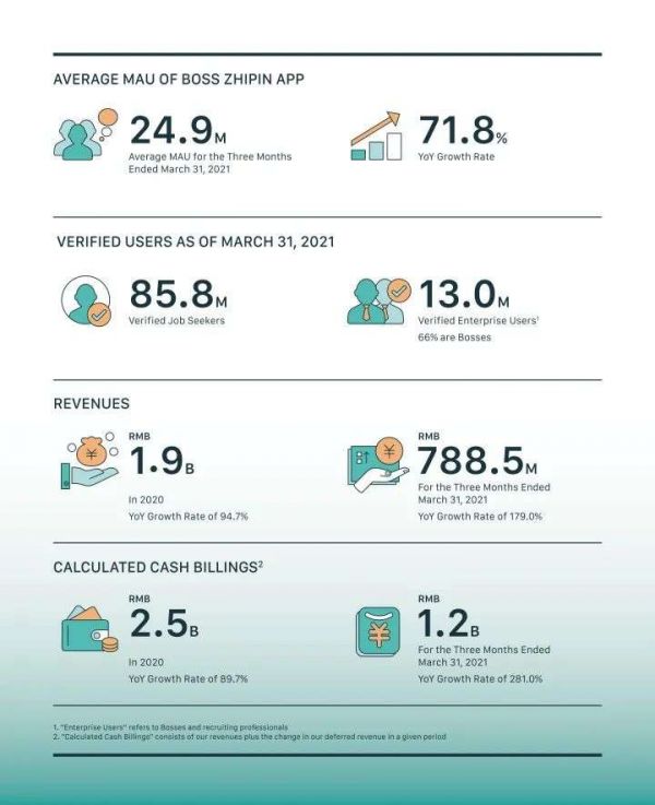 据灼识咨询报告,按MAU计,BOSS直聘已经成中国最大的在线招聘平台。就2020年平均移动MAU增速而言,BOSS直聘是中国前五大在线招聘平台中增速最快的公司。