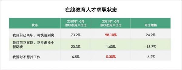 与此同时,正在求职中的在线教育从业者(1年内拥有在线教育从业经验的人才 ),今年处于“已离职,可快速到岗”的用户比例高达98.1%,比去年同期增长24.9%。