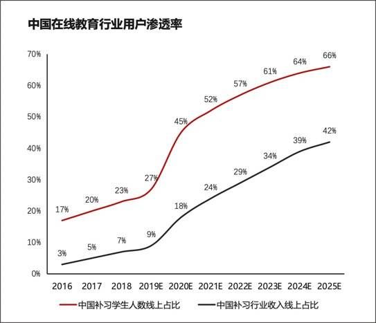 据华兴资本发布的《中国创新经济报告2021》,中国补习学生人数的线上占比在2019年为27%,而到了2020年,已经升至49%。华兴资本预测,到2025年,在线教育的渗透率将达到66%。