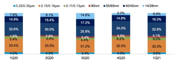 在2021年一季度电话会中,中芯国际相关发言人预测,成熟制程到今年年底产能将持续满载,新增产能主要在下半年形成。从2021年一季度财报中,中芯国际的主要产能还是集中在成熟制程上,55/65纳米制程的营收占比最多,为32.8%。