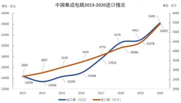 中国也是最大的需求国。根据世界半导体贸易统计组织统计,2020年全球半导体市场销售额4390亿美元;另一边,中国海关总署的数据显示,中国2020年集成电路进口金额为24207.3亿人民币,约等于3873亿美元,也就是说,2020年中国集成电路进口金额占全球销售额的大约88%。此外,中国大陆的设计公司将近2000家,全球的设计公司加起来也不会超过中国大陆的总额。