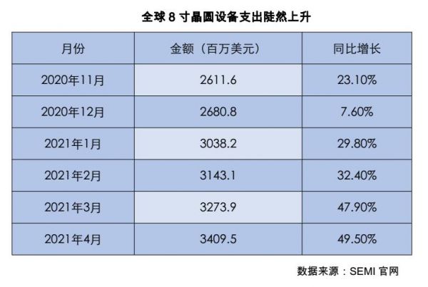 如果扩产,设备需求也要相应增加。根据国际半导体产业协会SEMI的数据,北美半导体设备销售金额连续五个月创纪录增长。2021年4月,半导体设备销售额同比增长了49.5%,为过去五个月中最高。SEMI报告显示,全球8寸晶圆设备支出在2012年-2019年曾长期徘徊在20亿美元到30亿美元,之后在2020年超过30亿美元大关,今年设备支出预计将达到40亿美元。