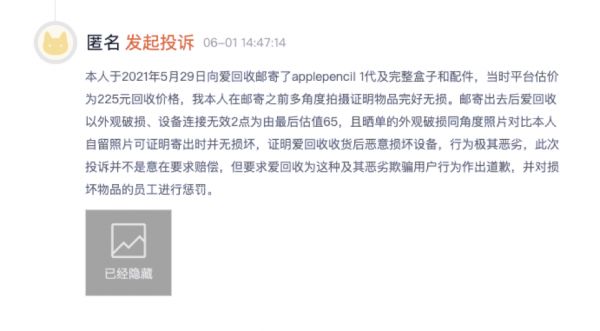 以最新投诉案例为例,有消费者称爱回收邮寄回收恶意损坏用户设备后压价。