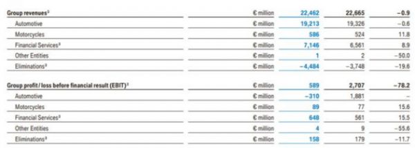 2. 宝马集团公布了2019年一季度财报。今年一季度,宝马集团营收为224.62亿欧元,同比下滑0.9%,息税前利润为5.89亿欧元,同比下滑高达78.2%。其中,汽车业务息税前利润为-3.1亿欧元,上年同期为18.81亿欧元,汽车业务利润率为-1.6%,而去年同期为9.7%。这是宝马集团汽车业务自2009年后一季度首次出现亏损。
