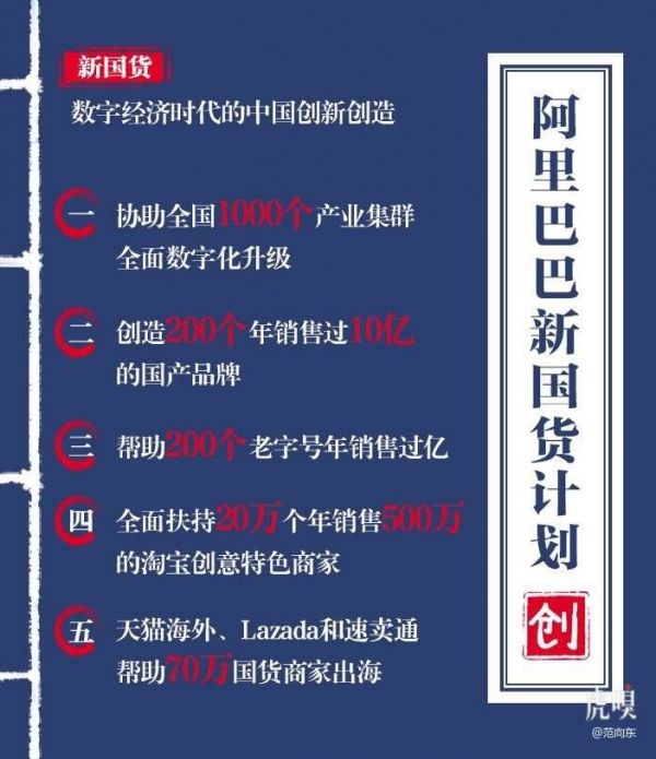2. 今天阿里发布新国货计划:协助全国1000个产业集群全面数字化升级;创造200个年销售过10亿的国产品牌;帮助200个老字号年销售过亿;全面扶持20万个年销售500万的淘宝创意特色商家;天猫海外、Lazada和速卖通帮助70万国货商家出海。