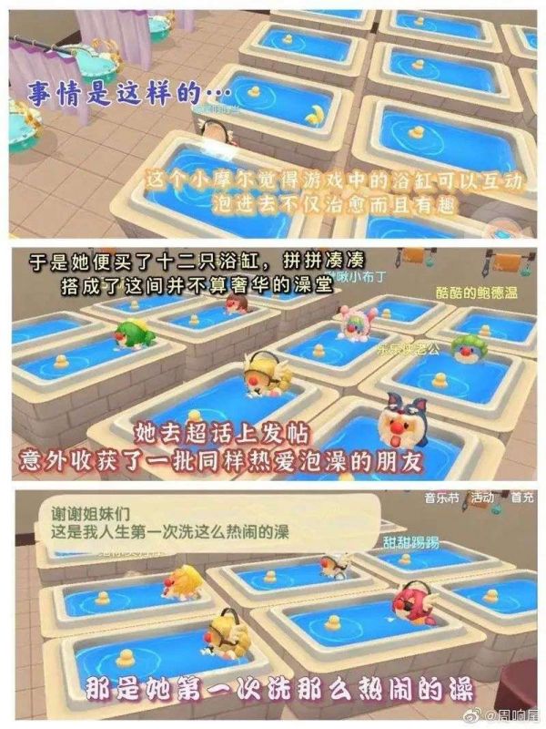 摩尔庄园内还出现了“网红打卡地”。“雷雷雷蛙”老板把自家装饰成了网咖;“可嘟噜啊噜”在农场上建了教室和自习室;“响尾叮叮当”在家里摆满浴缸,缸里泡的全是慕名前来搓澡的“小摩尔”......