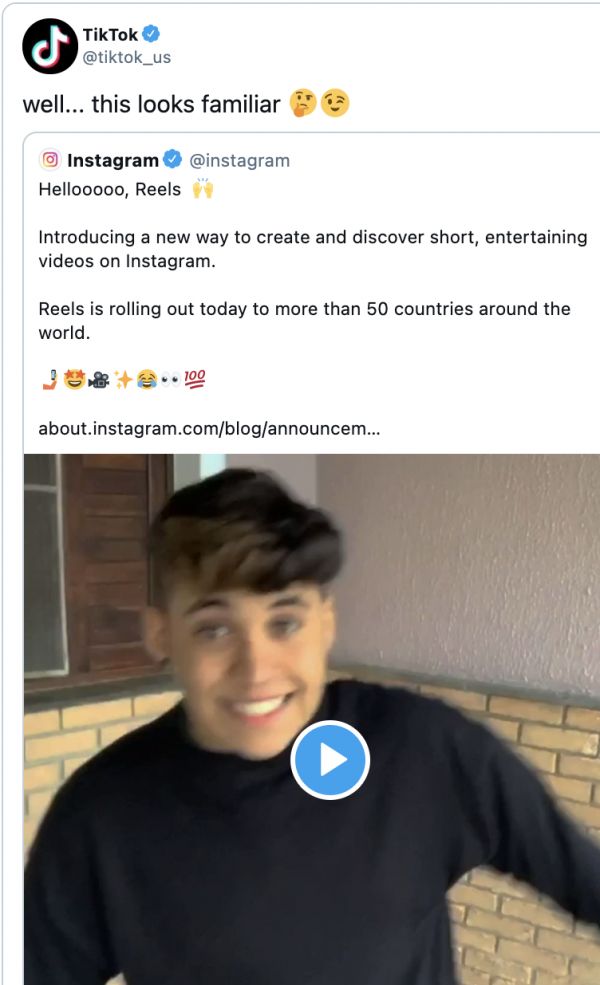 当Snapchat在市场上风头渐弱,Facebook又把目光瞄向了新的爆款APP:TikTok。这一次,Facebook同样采取了双管齐下的策略。2018年8月,Instagram官宣推出新功能Reels,允许用户拍摄上传和浏览短视频。这一功能无疑是直指TikTok,引得TikTok官方转推Instagram这条Twitter,并尴尬留言说“额……看起来好眼熟啊”。