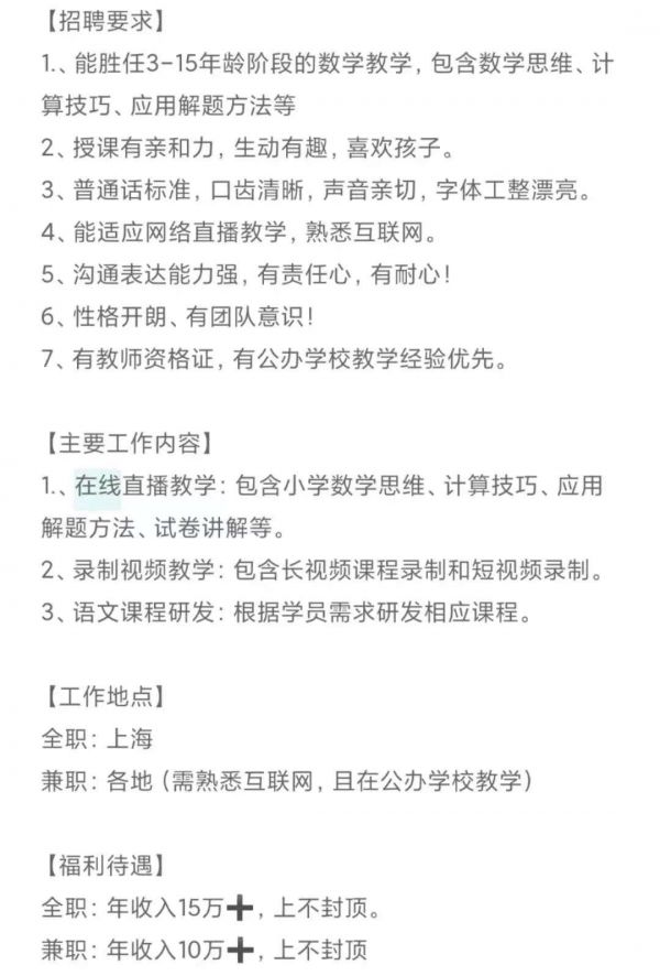 “一般情况下,兼职的在校教师都不会露脸参加直播课堂、课程视频的录制。”她指出,由于兼职的在校教师均拥有教师资格证书,且有在职的教学及教研经验,因此一直是机构在课程、教材开发方面的中坚力量。
