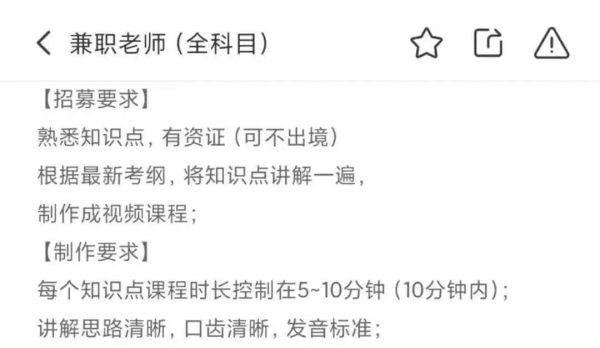 在直聘网站上,懂懂笔记发现仍有一部分校外培训和在线教育机构,在招聘拥有教师资格证、熟悉小初高中学校的学科(三年及以上相关教学经验)兼职教师。有教育行业人士透露,目前教师资格证考取通过率约25%。拥有教学资质的教师,一般都供职于正规学校,只有一小部分暂未通过公办学校招考、不甘委身于私立学校的教师,才会选择加入校外培训机构。