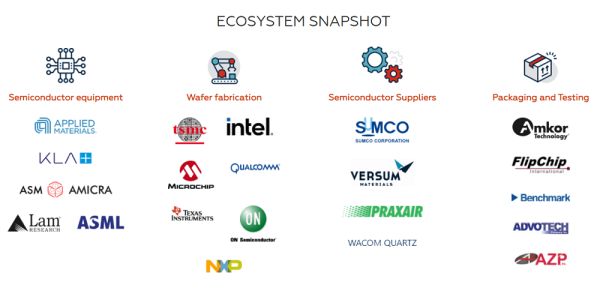 亚利桑那州的半导体产业布局已有数十年的历史,拥有完善的半导体生态。根据亚利桑那州官网,其半导体生态覆盖半导体设备、材料、晶圆制造、封装及测试四个领域,ASML、应用材料、台积电、英特尔、高通、恩智浦等众多行业供应链巨头都在其中。