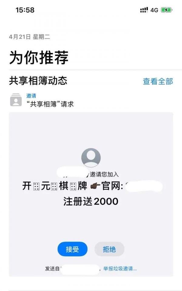 如果你同意了邀请,他们还可以进一步推送宣传照片或者视频到共享相簿,并让你的设备看到这些推广内容,从而增强广告效果。