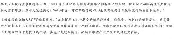 使用效果上,「摩尔元数」能够帮助下游客户低成本、高效率的自主构建MES系统来实现数字化转型;通过低代码开发平台、行业工具箱、经验套件库、工业知识库等,能够帮助开发者降低开发门槛提高开发效率。