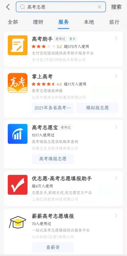 最近,不少人在支付宝上看到了高考志愿填报服务的身影。在支付宝搜索“高考志愿服务”,能看到“高考助手”“高考志愿者”“掌上高考”“优志愿”等服务机构的小程序。除了官方的高考助手,其他服务机构均为各自的品牌企业运营。